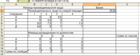 С учетом производительности труда всех работников по каждой операции, менеджеру необходимо назначить: сотрудника A на должность № 4, сотрудника B на должность №1, сотрудника C на должность №2, сотрудника D на должность №3,. При этом коллектив добьется общей времени упаковки 29,50 мин.