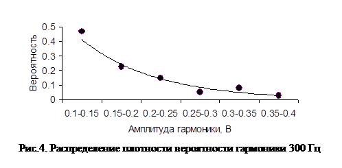 Результаты опыта показали присутствие гармоники 300 Гц в рельсовых цепях метрополитена вблизи фидеров обратного тока. На рис. 4 показана плотность распределения вероятности гармоники 300 Гц. Вероятности, полученные по результатам экспериментальных данных, обозначены точками. Аппроксимированная кривая проведена линией. Максимум гармоники 300 Гц составил 379 мВ, минимум – 100 мВ, математическое ожидание – 177 мВ, среднеквадратическое отклонение – 74 мВ. Наличие этой гармоники говорит о неправильной работе сглаживающих устройств на тяговой подстанции. Эта гармоника не может повлиять на работу системы АЛС-АРС.