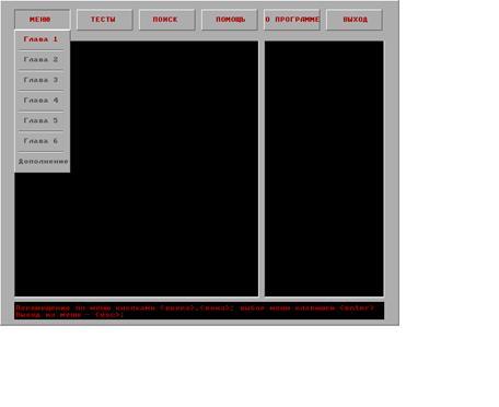 Обучающая система должна обеспечить пользователю простоту получения информации по предметной области. Для поиска слова в тексте учебника должна существовать система поиска. Для удобства обращения с программой должна существовать статусная строка, являющаяся подсказкой, и содержащая возможные комбинации клавиш в том или ином случае.