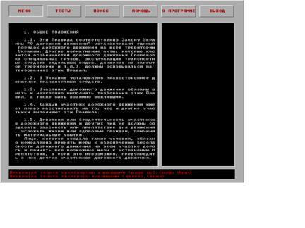 Данный ПП предназначен для предоставления справочной информации о ПДД, с возможностью произвести поиск необходимого слова или фразы, определить уровень подготовки пользователя с помощью тестирования; при этом применяется удобный и понятный интерфейс со справкой по навигации и системой подсказок.