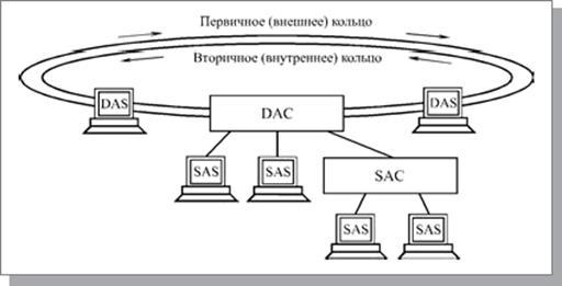 Кроме собственно абонентов (компьютеров, терминалов и т.д.) в сети используются связные концентраторы (Wiring Concentrators), включение которых позволяет собрать в одно место все точки подключения с целью контроля работы сети, диагностики неисправностей и упрощения реконфигурации. При применении кабелей разных типов (например, оптоволоконного кабеля и витой пары) концентратор выполняет также функцию преобразования электрических сигналов в оптические и наоборот. Концентраторы также бывают двойного подключения (DAC – Dual-Attachment Concentrator) и одинарного подключения (SAC – Single-Attachment Concentrator).[3]