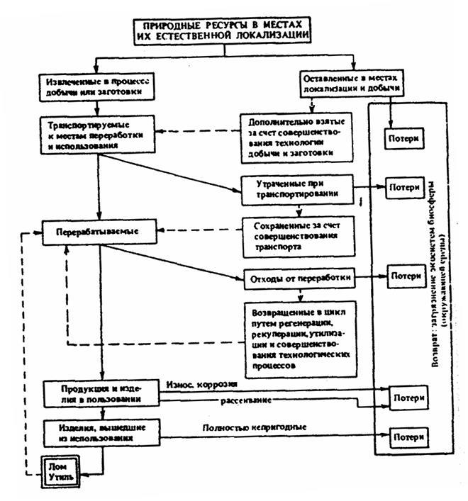Таким образом, ресурсные циклы будут постепенно преобразовываться (трансформироваться) на основе тех же принципов, что и естественные циклы — взаимосвязи и замкнутости. Данная организация ресурсных циклов получила название безотходных производств, понимаемых как совокупность технологических процессов, из которых отходы одних используются в качестве сырья для других, что обеспечивает их полную утилизацию. Реальным же, на наш взгляд, является переход к малоотходным производствам, характер ризующимся максимально возможной утилизацией выбросов.