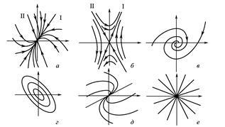 . На рис.1б стрілками показаний напрямок руху вздовж траєкторії при зростанні . Сепаратриса II є єдиною траєкторією, якій відповідає розв’язок, що прямує до 0 при . Тільки дві траєкторії I і II є прямолінійними. Інші траєкторії криволінійні й зі зростанням йдуть із в . Сепаратриси I і II розділяють фазову площину на 4 області, у яких лежать криволінійні траєкторії.