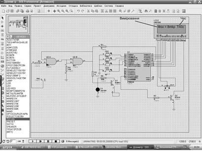 Моделювання проводилось за допомогою програми Proteus 7 Professional [4]. Так як за відсутністю програмних еквівалентів і електронних компонентів доцільно виконати моделювання роботи, яке полягає в виводі на дисплей значення вимірювання радіації, світлової та звукової індикації випромінювання, не вдалось. Замість блокинг генератора на вхід одновібратора подається прямокутній сигнал і спостерігаємо на дисплеї (Рис. 4.1) .
