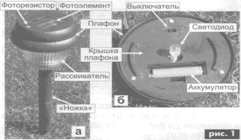 Устанавливается светильник с помощью своей «ножки» путем погружения ее в землю. Обычно на даче устанавливают несколько светильников, обозначающие какой-либо контур, например дорожку или крыльцо дома. Единственный светодиод светильника не в состоянии осветить площадь дачи или усадьбы, он лишь обозначает место и выполняет декоративную функцию. К светильнику прилагается описание, где подробно описывается внешнее устройство и правила пользования светильником, но его технические характеристики не приводятся, поэтому автору пришлось самостоятельно их «добывать» путем осмотра, измерений и испытаний. Принцип работы светильника простой. В дневное время фотоэлемент, вмонтированный в верхнюю крышку плафона (рис.1,а), преобразовывает солнечную энергию в электрическую и заряжает аккумулятор. С наступлением темноты фоторезистор (датчик освещенности), также вмонтированный в верхнюю крышку плафона, через электронную схему включает единственный светодиод, излучающий желтый свет. Ночью аккумулятор разряжается и отдает запасенную днем электроэнергию. С рассветом тот же фоторезистор с помощью той же электронной схемы отключает светодиод. При достаточной освещенности фотоэлемент снова заряжает аккумулятор. Таким образом, светильник включается и выключается автоматически и работает автономно, без внешнего источника тока. Технические характеристики светильника: - аккумулятор - 1 шт., NiMH (никель-металло-гидридный), типоразмер АА, емкость 600 мА*ч, номинальное напряжение 1,2 В, расчетное количество циклов заряд-разряд - 500 раз;