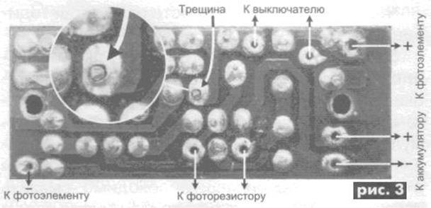 Чтобы аккумулятор получал достаточную порцию заряда, необходимо, чтобы солнечные лучи освещали фотоэлемент длительное время (рекомендуется 10... 12 ч). На практике это можно выполнить разве только в Африке. В странах СНГ много пасмурных дней, даже летом, и достаточной порции заряда аккумулятор не получит, в результате, ночью светодиод будет включен непродолжительное время (всего несколько часов). В описанном садовом светильнике протекают малые токи, поэтому схема работает довольно надежно, но ничего вечного нет. Если возникли проблемы с транзисторами, то их необходимо заменить, они недефицитны, все они имеют корпус ТО-92 и одинаковую цоколевку, показанную на рис.4. Если вы присмотритесь к рис.3, то заметите на дорожке монтажной платы, в пайке светодиода, трещину. Она появилась в результате падения светильника. Светодиод имеет сравнительно большую массу и длинные ножки. Их необходимо было прикрепить к монтажной плате клеем, но изготовители этого не сделали, в результате -• трещина. Она устраняется повторной пайкой.