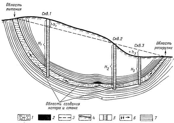 В скважинах с устьями, совпадающими с пьезометрической поверхностью (рис. 2, скв. 2),
