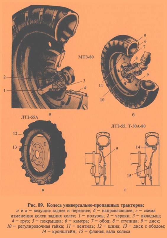 шинами. В результате сцепления ведущих колес с грунтом их вращательное движение преобразуется в поступательное движение трактора. По назначению колеса делят на ведущие, управляемые ведомые и комбинированные (одновременно ведущие и управляемые). Колесные тракторы общего назначения снабжены одинаковыми по размеру колесами. У универсально-пропашных тракторов обычно задние колеса большего размера, чем передние. На них приходится основная (до 70%) нагрузка от массы трактора, что обеспечивает лучшее сцепление колес с опорной поверхностью. Передние колеса несут меньшую нагрузку, чем задние. Вот почему ими легче управлять. При этом обеспечивается хорошая прямолинейность движения, что важно при междурядной