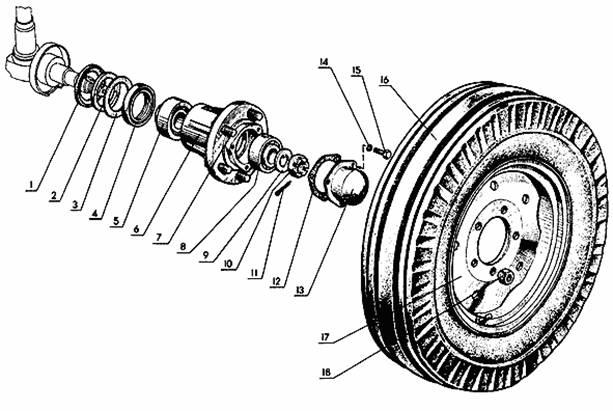 У некоторых универсально-пропашных тракторов диски задних колес привернуты болтами к фланцу 15 вала и кронштейнам 14. Переставляя диски 9 с одной стороны фланца вала и кронштейна обода на другую, можно изменять колею задних ведущих колес (до восьми вариантов). Ступица 8 переднего ведомого колеса вращается на двух роликовых конических подшипниках, установленных на полуоси и закрепленных корончатой гайкой 10, которой регулируют подшипники. Для лучшего сцепления с почвой передних ведущих колес предусмотрены грунтозацепы.