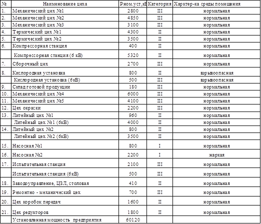 1. Сведенья об электрических нагрузках завода – таблица №1