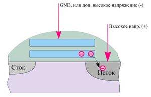Наличие заряда на "плавающем" затворе меняет вольт-амперные характеристики транзистора таким образом, что при обычном для чтения напряжении канал не появляется, и тока между истоком и стоком не возникает.