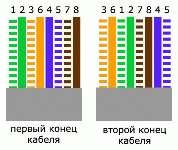 Схема подключения 2. ПК-ПК. При работе по этой схеме провода кабеля с одного конца располагаются аналогично схеме подключения 1, с другого же конца порядок расположения проводов в коннекторе изменяется.