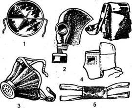 1 - респиратор типа «Лепесток»; 2 - противогаз; 3 - респиратор Р-2; 4 - противопыльная тканевая маска ПТМ-1; 5 - ватно-марлевая повязка