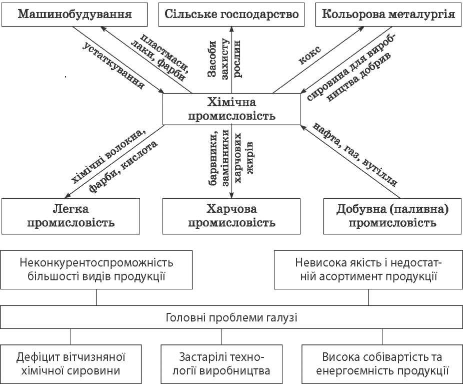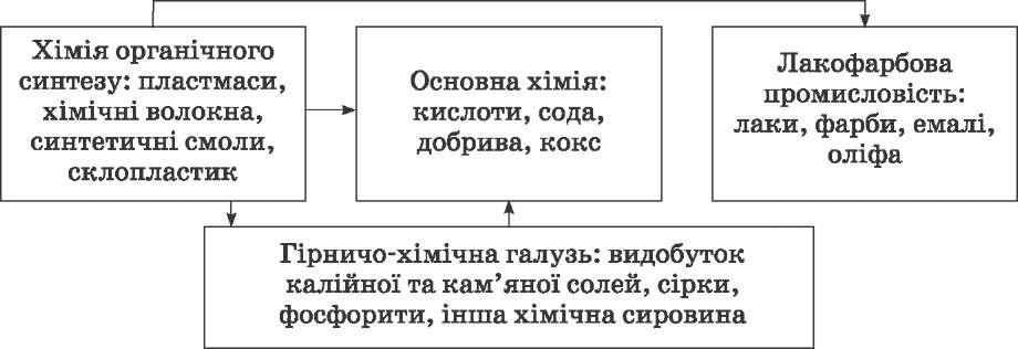 Виробничі зв'язки галузей хімічної промисловості  Підприємства гірничо-хімічної галузі тяжіють до районів видобутку корисних копалин, що використовуються як хімічна сировина. Кухонну сіль добувають і переробляють у Слов'янську, Артемівську, Криму. По- клади калійної солі розробляють у Калуші і Стебнику, сірки — у Новому Роздолі. Основна хімія — це галузь хімічної промисловості, що включає коксохі- мічне виробництво, виробництво мінеральних добрив, кислот, соди. Коксохімічна промисловість є базою для розвитку великої кількості су- путніх і допоміжних підприємств, що переробляють доменні й коксові гази, феноли, смоли тощо. Виробництво азотних добрив розміщується поруч з коксохімічними підприємствами (Дніпродзержинськ, Запоріжжя, Горлівка) або тяжіє до споживача (Черкаси, Рівне, Одеса). Виробництво калійних добрив роз- міщено поблизу родовищ сировини (Калуш, Стебник). Підприємства, що виробляють фосфорні добрива, працюють на імпортній (Винниця, Одеса, Суми) та місцевій (Костянтинівка) сировині. Виробництво сірчаної кислоти має значну сировинну базу і розміщено у Костянтинівці, Калуші, Перво- майському. Виробництво соди розміщується поблизу родовищ, оскільки це дуже матеріаломістка галузь. Основні центри — Слов'янськ, Лисичанськ, Красноперекопськ. Хімія органічного синтезу як сировину використовує переважно нафту і газ, тому розміщена в районах їх видобування та у місцях, де прокладені нафто- і газопроводи. До хімії органічного синтезу належать виробництва синтетичних смол, пластмас і хімічних волокон. Найбільші підприємства галузі розташовані в Донбасі та Придніпров'ї. Виробництво полімерних матеріалів базується на використанні продуктів нафтопереробної, газової, коксохімічної промисловості (Донецьк, Запоріжжя, Луцьк — виробництво 72