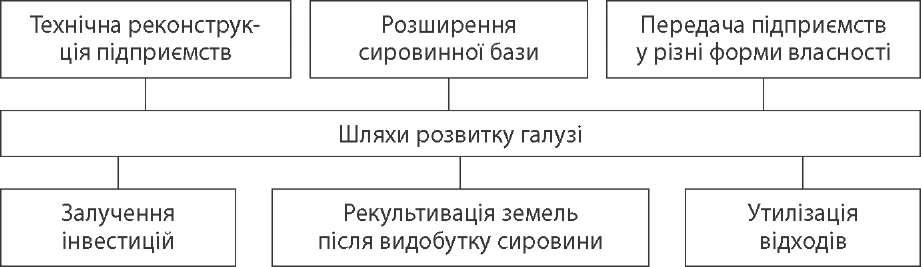 синтетичних смол і пластмас; Київ, Черкаси, Чернігів — виробництво хі- мічних волокон). Частково виробництво базується на використанні хімічної сировини, що потрапляє продуктопроводами з Росії. Високого рівня розвитку в Україні досягли лакофарбова промисловість (центри — Дніпропетровськ, Львів, Одеса, Харків), виробництво синтетич- них барвників (Рубіжне, Красноперекопськ). На базі нафтопереробної і газової промисловості розвивається нафтохі- мічна (Бердянськ, Кременчук, Херсон) і гумово-асбестова (Дніпропетровськ, Біла Церква) промисловість. Усе більшого значення в Україні набувають виробництво синтетичних миючих засобів, фармацевтика. Ці галузі належать до наукомістких, тому їхні виробництва розміщені у великих містах — Донецьку, Дніпропетров- ську, Києві, Запоріжжі, Одесі та ін. Міжгалузеві зв'язки хімічної промисловості  лісова й деревообробна промисловість Лісова й деревообробна промисловість — сукупність галузей, що спеціалі- зуються на заготівлі та переробці деревини, виробництві меблів і напівфабри- катів, різних видів паперу, картону, штучного волокна, целюлози. 73