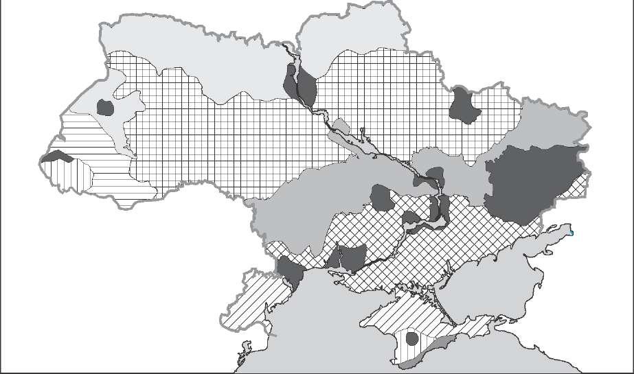 Зону перетинають річки басейнів Дністра, Південного Бугу, Дніпра, Сівер- ського Дінця. Густота річкової мережі зменшується із заходу на схід. Світло-сірі, сірі й темно-сірі лісові ґрунти займають великі площі на Пра- вобережжі, на Лівобережжі переважають опідзолені чорноземи. У Лісостепу переважають дубові ліси (діброви). Видовий склад лісів част- ково змінюється із заходу на схід; на крайньому заході — бук, на Придніпров- ській височині — граб, клен, явір, на Лівобережжі — дуб, клен гостролистий, липа. Підлісок складається з ліщини, кизилу, бересклету, глоду. Характерним є поєднання тваринного світу Полісся і Степу. У лісах водяться дикий кабан, борсук, лось, козуля, куниця, вовк, білка, заєць- русак, лисиця, із птахів — сіра куріпка, перепел. Майже скрізь живуть ховрашки, хом'яки, миші. У долинах річок поширені деякі види куликів, пастушкових, диких качок. Зустрічаються видра, бобер, акліматизовано ондатру. зона степу Степова зона розташована на південь від Лісостепу і простягається до Азово- Чорноморського узбережжя і Кримських гір. Степ займає 40 % площі України й охоплює Причорноморську низовину, південну частину Придніпровської і По- дільської височин, а також рівнинну час- тину Кримського півострова. Клімат помірно континентальний. Середня температура січня змінюється із заходу на схід від -2 до -9 °С; липня — від +20 до +24 °С. Річна кількість опадів зменшується з північного заходу на пів- денний схід від 450 до 300 мм. Через недостатність атмосферних опадів густота річкової мережі незнач- на. Найбільші річки є транзитними: Дніпро, Південний Буг, Дністер, Дунай із притоками. Місцевий стік формується за рахунок талих снігових вод. Ґрунтово-рослинний покрив: у північній частині — лугові степи з чорноземами типовими (майже скрізь розорані). У центральній смузі в умовах недостатнього зволоження розвивається природна різнотравно- типчаково-ковилова рослинність на чорноземах звичайних, посухостійке різнотрав'я — на чорноземах південних. Сухостепові південні ландшафти із типчаково-ковиловою і полиново-злаковою рослинністю сформували- ся на каштанових солонцюватих ґрунтах. Часто зустрічаються солонці та солончаки. Цілинні степи, а також деревна рослинність збереглися тільки в заповідниках (Чорноморський біосферний, Дунайські Плавні, Український степовий, Асканія-Нова, Луганський), у долинах річок і на схилах балок. Рослинність: північні райони — різнотравно-злакова степова рослин- ність; далі на південь — ковилово-типчакова, зустрічаються злаки, полин, солянки, ковили, типчак, житняк. Із тварин, крім численних дрібних гри- зунів, у степу живуть ласка, горностай, степовий ховрашок, вовк, лисиця, зустрічаються борсук, козуля. Серед птахів — жайворонок, перепел, ку 31