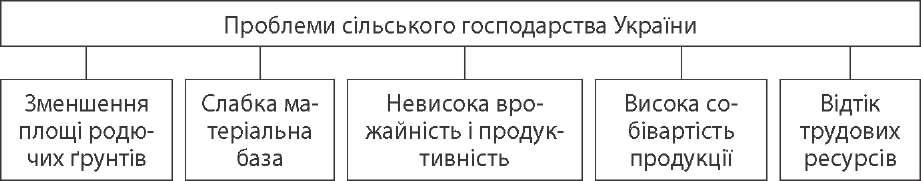 найменше — Полісся (68,9 %), тут майже третину площі сільськогосподар- ських угідь займають природні кормові угіддя. В Україні є невеликий потен- ціал для збільшення площі сільськогосподарських угідь. Це заболочені землі (Полісся) і землі, що потребують зрошення (південь України), їхня частка в структурі земельного фонду складає 2,5,%.  Рослинництво — провідна галузь сільського господарства, яка займається вирощуванням сільськогосподарських культур. Основною зерновою культурою України є озима пшениця, на яку припадає майже 20 % посівних площ. Основними районами вирощування озимої пше- ниці є області степової та лісостепової зон. У поліських та західних районах частка посівів пшениці значно менша. Цінною продовольчою культурою в Україні є озиме жито. Основні райони ви- рощування озимого жита — Полісся і західна частина країни. Такі ж площі, як і жито, займає овес. В Україні він є допоміжною зернофуражною культурою. Ячмінь — друга за розмірами посівних площ і за валовими зборами зерна (близько 20 %) яра зернова культура. Ярий ячмінь вирощують, як і озиму пше- ницю, в степовій та лісостеповій зонах, частково — на Поліссі. Озимий ячмінь вирощують у південній частині Степу та в передгірських районах Криму. Третє місце в Україні за площею посівів посідає кукурудза. Найкращі умо- ви для її вирощування — північний і центральний Степ, південь Лісостепу. Значні площі в Україні відводяться під гречку. Найбільші посіви гречки зосереджені у Поліссі, а також частково у Лісостепу. Просо переважно вирощують у Лісостепу і Степу. Рис як продовольчу культуру вирощують на поливних землях у Микола- ївській, Херсонській областях та в Криму. Технічні культури: цукровий буряк, соняшник, льон-довгунець, хміль, тю- тюн. Основна культура в Україні — цукровий буряк (найбільші площі — у Лісо- степу, в Тернопільській, Вінницькій, Черкаській і Хмельницькій областях; є також посіви у південних районах Полісся і північних районах Степу). Соняшник — основна олійна культура. За обсягом його вирощування Україна посідає перше місце у світі; головні райони оброблення — степові (Донецька, Дніпропетровська, Луганська, Запорізька обл.). 80