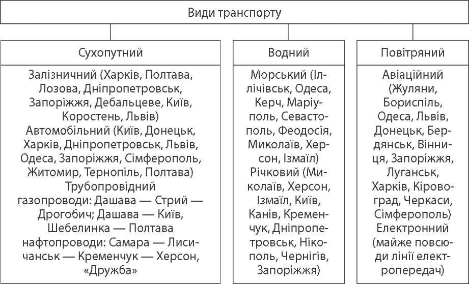 нелли і Мармуровим морем, до Середземного моря та Атлантичного океану. Загальна довжина морської берегової лінії близько 2000 км. Найбільші мор- ські порти: Іллічівськ, Одеса, Південний, Керч, Маріуполь, Феодосія, Ялта. З 1978 р. функціонує одна з найбільших поромних переправ Іллічівськ— Варна (435 км). Крім цього діють такі поромні переправи, як Іллічівськ—Поті (Грузія), Керч—Тамань (Росія), Євпаторія—Стамбул (Туреччина). Через морські порти Україна експортує кам'яне вугілля, марганцеві руди, хімічну сировину, цукор, здійснює міжнародний туризм. Однак багато суден потребують ремонту. Вони роками не підлягали техніч- ному огляду. Усе це не сприяє збільшенню кількості й модернізації водного транспорту, гальмує розвиток зовнішньоекономічних зв'язків. Характеристика морського і річкового транспорту | Переваги | Недоліки | Основні види вантажів | | Майже не обмежена вантажопід- йомність, надійність, універсаль- ність, низька собівартість перевезень | Низька швид- кість, залеж- ність від по- годних умов, забруднення навколишньо- го середовища, обмежена ма- невреність | Різноманітні вантажі, але переважають наливні, навалювальні і насипні. Серед них особливе значення мають: нафта і продукти її переробки, зерно, будівель- ні матеріали, металобрухт, зріджений газ, залізна руда, автомобілі, промисло- ве устаткування. В останні десятиліття, завдяки контейнерній революції, збіль- шуються обсяги генеральних або тарно- штучних вантажів | Головна спеціалізація повітряного транспорту — перевезення пасажи- рів та цінних термінових вантажів. Через територію нашої країни проходять важливі міжнародні авіалінії. Понад 60 % повітряних перевезень припадає на міжнародні авіарейси. Найбільшими авіаційними кампаніями в Україні є: «Авіалінії України», «Аеросвіт», «Міжнародні авіалінії України». Характеристика повітряного транспорту | Переваги | Недоліки | Основні види вантажів | | Велика швидкість, незалежність від характеру місцевості, можли- вість доставки вантажів і паса- жирів у важкодоступні райони | Обмежена вантажопід- йомність, висока собівар- тість перевезень, залеж- ність від погодних умов | Швидкіс- ні, дорогі й екстрені вантажі | Україна і світове господарство. Зовнішні економічні зв'язки України Після проголошення незалежності Україна безпосередньо вступила в сис- тему світового географічного поділу праці. Міжнародний географічний поділ праці — форма поділу праці, що виража- ється у спеціалізації окремих країн на виробництві певних видів продуктів або послуг, якими вони обмінюються. 86
