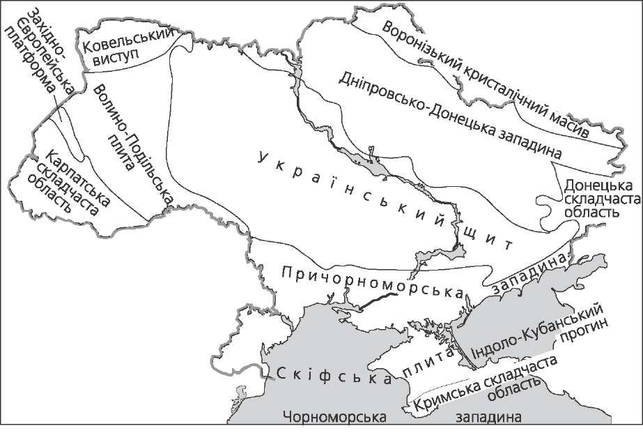 Тектонічна будова України  В основі більшої частини території України лежить Східноєвропейська платформа. На півдні до неї приєднується молода платформа — Скіфська плита. Крайній південь і захід представлені альпійською складчастістю. Східноєвропейська платформа — одна з найдавніших на Землі, її форму- вання закінчилося близько 2 млрд років тому. Протягом наступного часу її фундамент то занурювався, то підіймався, зазнаючи розломів, уздовж яких окремі ділянки зміщувалися одна відносно одної. Таким чином, тут виділився Український щит — ділянка, де осадовий чохол мінімальний і давні кристалічні породи виходять на поверхню. Щит простягнувся від Рівненської і Житомирської областей до узбережжя Азовського моря. Його довжина — 1100 км, ширина від 100 до 250 км. На захід від щита знаходить- ся Волино-Подільська плита з потужністю осадового чохла 2000—2500 м. На лівобережжі Дніпра, уздовж ріки, простяглася Дніпровська-Донецька западина з глибоко зануреним фундаментом і осадовим чохлом потужністю 4000—6000 м. Приморська частина України і північний Крим лежать на молодій Скіф- ській платформі. Фундамент плити рівний, перекритий осадовим чохлом потужністю від 500—1000 м на півдні до 3000—6000 м на півночі. Особливе місце в тектонічній структурі України займає область альпій- ської складчастості. Перед складчастими областями сформувалися передгір- ні прогини з потужним осадовим чохлом. Складчасті області продовжують формуватися і в даний час, про що свідчать періодичні землетруси. Існує зв'язок між тектонічними структурами і великими формами рельє- фу. Так, Українському щиту відповідають Придніпровська та Приазовська 12