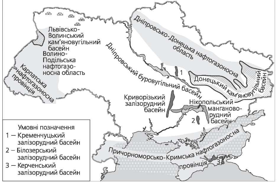 переважно вапняковими породами мезозойського віку. Передкарпатський прогин, що відділяє Карпати від Східноєвропейської платформи, утворений у неогені уламковими та соленосними товщами. Мінерально-сировинні ресурси Мінерально-сировинні ресурси — сукупність розвіданих запасів корисних копалин, які використовуються або можуть використовуватися в господар- ській діяльності.  На території України поєднуються різні за віком та умовами утворення тектонічні структури, тому в її межах сформувалися різні гірські породи і відповідно — корисні копалини. Серед паливних корисних копалин найбільшу цінність мають родови- ща нафти й газу, зосереджені у Дніпровсько-Донецькій нафтогазоносній області, Карпатській і Причорноморсько-Кримській нафтогазоносних провінціях. В Україні відкрито понад 150 нових родовищ нафти й газу. Найбільші родовища нафти в Прикарпатті — Долинське, Бориславське, газу — Дашавське, Калуське. У Дніпровсько-Донецькій області відзнача- ються родовища газу — Західнохрестищенське, Шебелинське, Єфремівське (Харківська обл.), нафти — Прилуцьке (Чернігівська обл.), Радченківське, Сагайдацьке (Полтавська обл.). Перспективним є Причорноморський ре- гіон. Тут у прибережних частинах Чорного моря виявлено поклади газу на глибині 700—750 м. Велике значення має вугілля, що видобувають у Донецькому, Львівсько-Волинському кам'яновугільних і Дніпровському буровугільному басейнах. Також добувають горючі сланці в Карпатах, на Поділлі, у Кіровоградській області. Торф'яні родовища зосереджені на Поліській низовині. Україна має величезні запаси залізних і манганових руд. Є запаси ти- танових і ртутних руд; не до кінця розвідані запаси мідних, хромових, алюмінієвих руд і золота. Деякі руди кольорових металів в Україну ім- портуються. Географія розташування родовищ рудних корисних копалин в Україні представлена так: залізні руди — Криворізький і Керченський басейни, Кре- менчуцький і Білозерський райони; манганові руди — Нікопольський і Вели- котокмацький басейни; титанові руди — Іршанське (Житомирська обл.) і Са- мотканське (Дніпропетровська обл.) родовища; уранові руди — Жовті Води 16