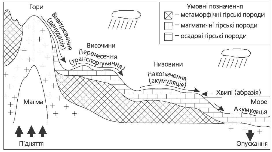 у місцях активних піднять утворюються гори, у зонах опускань — морські чи океанічні басейни, западини, прогини. Але тектонічні рухи відбувалися не лише в давні часи, а й на новому етапі (найчастіше у неогеновому та чет- вертинному періодах) — це неотектонічні рухи. Саме неотектонічні рухи у взаємодії із зовнішніми силами утворюють той рельєф, який ми спостері- гаємо. Походження рельєфу і закономірності його розміщення відбиваються на геоморфологічних картах. Формування рельєфу обумовлюють не лише тектонічні рухи, але й гео- логічна будова певної території, зокрема склад гірських порід. Руйнування кристалічних порід відбувається дуже повільно, тому в районах їх залягання утворюються височини, плато, кряжі. Осадові породи піддаються руйнівному впливу зовнішніх сил — води, вітру, льоду, які спричиняють такі рельєфо- утворюючі процеси: денудація — комплекс процесів знесення й перенесення (водою, вітром, льодом, прямим впливом сили тяжіння) продуктів руйнування гірських порід з їх подальшим накопиченням на знижених ділянках земної по- верхні; акумуляція — процес накопичення пухкого мінерального матеріалу та органічних решток на земній поверхні; ерозія — процес руйнування ґрунтів і гірських порід під дією постійних і тимчасових вод стоків, а також вітру; абразія — процес руйнування берегів морськими (озерними) хвилями. Рельєфоутворюючі процеси Розрізняють два види форм рельєфу. Перший: генетичні форми рельє- фу — головні й найбільші його елементи (низовини, височини, гори); дру- гий — конкретні місцеві (дрібні, невеликі) форми рельєфу, якими є річкові долини, яри, балки, осипи та ін. 18