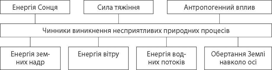 Виникають у гірських районах Карпат і Південного берега Криму внаслідок тривалих злив, бурхливого танення снігів у горах. Селі руйнують будинки, дороги, споруди, орні землі. Для боротьби із селевими потоками необхідно споруджувати спеціальні греблі й дамби на річках. Зсуви — відрив і переміщення мас гірських порід схилами під дією сили тяжіння. Вони виникають при ослабленні міцності порід, вивітрюванні чи перезволоженні опадами і підземними водами, від сейсмічних поштовхів, від рясного поливу садів і городів на схилах тощо. Ці явища характерні для висо- ких берегів Дніпра, Азово-Чорноморського узбережжя, Українських Карпат, Південного берега Криму. Ерозія — руйнування водою і вітром верхнього шару ґрунту, змив чи розві- ювання його частинок. Вітрова ерозія викликає чорні бурі на півдні України. Водна і вітрова ерозія зменшує площу ріллі та родючість ґрунту, руйнує до- роги й інші споруди, замулює канали і водойми. Інтенсивні ерозійні процеси спостерігаються в Карпатах і Кримських горах, на орних землях (особливо Східної України). Для боротьби з ерозією необхідно застосовувати ґрунтоза- хисні сівозміни, оранку поперек схилу, терасування тощо. Карст — процеси та форми рельєфу поверхні й підземних порожнин і печери, що виникають у розчинених водою гірських породах (вапняк, гіпс, кам'яна і калійна сіль). Карст ускладнює будівництво, землеробство, бо не лише висушує ґрунт, але й спотворює поля провалами і вирвами. Карстові печери використовують як об'єкт туризму. Характерні для Кримських гір, Поділля, зустрічаються в Донбасі. Заболочування — зростаюче перезволоження ґрунтів зі зміною ґрунто- рослинного покриву. Заболочування буває природним (унаслідок надлишку вологи, наприклад, у Поліссі) або антропогенним (будівництво водосховищ і відстійників води; надмірне зрошення). Вторинне засолення ґрунтів відбувається внаслідок підняття рівня підземних вод при надмірному поливі в умовах наявності солей у гірських породах (південь і північ України). Такі ґрунти вимагають застосування спе- ціальних мір: вапнування, гіпсування тощо.  Протікання або активізація багатьох сучасних фізико-географічних явищ значною мірою зумовлені порушенням людиною природних потоків речови- ни й енергії, застосовуванням техніки. Тому, перш ніж планувати якісь змі- ни у природі, необхідно заздалегідь спрогнозувати, до яких несприятливих фізико-географічних явищ ці зміни можуть призвести. 27