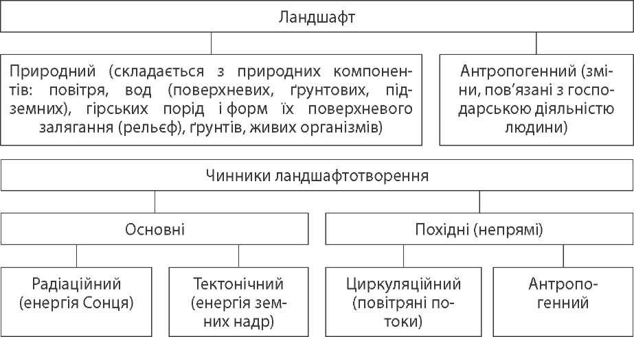 розділ ііі. природні комплекси і фізико-географічне районування Природно-територіальні комплекси Природно-територіальні комплекси (ПТК), або ландшафти,— це різні за розмірами ділянки з певною однорідністю фізико-географічних умов, що характеризуються закономірним поєднанням взаємопов'язаних і взаємозалеж- них природних компонентів. У наш час людина дуже активно впливає на окремі компоненти природи, але, оскільки всі компоненти нерозривно пов'язані, зміна одного з них призводить до зміни всього природного комплексу. Досліджуючи ландшафти, можна передбачити негативні наслідки діяльності людини, що є дуже важливим для збереження природного середовища. Відмінність ландшафтів зумовлюється впливом різних чинників ланд- шафтотворення, які поділяються за значенням і носіями.  Кожна ділянка Землі зазнає різного впливу чинників ландшафтотворен- ня, тому кожний ландшафт є по-своєму неповторним. Ландшафтна карта від- биває зональність розподілу ландшафтів, яка виявляє себе у зміні кількості тепла, зволоження, типів ґрунтів, рослинного і тваринного світу, фізико-гео- графічних процесів і явищ. Фізико-географічне районування Фізико-географічне районування — це виділення великих і відносно однорід- них за природними умовами територій, які відрізняються за ландшафтами. Фізико-географічне районування проводиться з метою полегшення ви- вчення природних територій на науковій основі. Чим детальніше здійснено фізико-географічне районування, тим кращою виявляється вивченість території. Оскільки господарська освоєність території України є високою, розв'язання проблем природокористування потребує всебічного врахування природних умов і ресурсів. 28