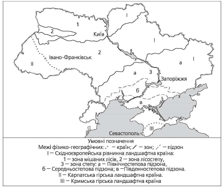 Зона мішаних лісів займає близько 20 % території України, представлена Українським Поліссям. Південна межа проходить поблизу Рави-Руської, Львова, Золочева, Шепетівки, Житомира, Києва, Ніжина, Глухова. Характерні низовинний рельєф, гра- війні, піщані й піщано-глинисті відклади. В антропогені, під час дніпровського зле- деніння, сформувалися піщані рівнини, моренні пасма, еолові форми рельєфу. Клімат помірно континентальний; літо тепле й вологе, зима м'яка. Середня температура січня змінюється із заходу на схід від -4,5 до -8 °С, липня — від +17 до +19 °С. У середньому за рік випадає 600— 680 мм опадів (близько 70 % у теплий період). Густа річкова мережа, багато боліт. У крей- дових породах зустрічається карст. Багато озер, найбільше — Світязь. Ґрунти дерново-підзолисті та болотні. Переважають соснові, дубово- соснові та дубово-грабові ліси. Є значні ділянки дубово-липових, вільхово- березових і ясенево-вільхових лісів. Характерні козуля, лось, дикий кабан, вовк, лисиця, рись, куниця, за- єць, білка, борсук; завезено ондатру; птахи — тетерев, глухар, рябчик. У во- доймах живуть бобри, видри, дикі качки, кулики, понад 30 видів риб. Великі зміни спричинили водномеліоративні роботи (осушення перезво- ложених земель призвело до глибокого і незворотного перетворення при- родних ландшафтів), що були особливо масштабними в 1960—1970-ті pp. Аварія на Чорнобильській АЕС та інші наслідки діяльності людини також негативно вплинули на стан природного середовища й умови життя на- селення. Зона лісостепу Лісостепова зона простягається від Передкарпаття до Середньоруської висо- чини. Південна межа проходить лінією Ананьїв — Знам'янка — Олександрія — Світлогорськ — Красноград — Ізюм. На лісостепову зону припадає третина тери- торії України. Рельєф території різноманітний. На Правобережжі розташовані Волино-По- дільська та Придніпровська височини із плоскими та хвилясто-горбистими по- верхнями (плато), які по берегах річок розчленовані балками і ярами. Клімат Лісостепу помірно теплий, із достатнім і постійним зволожен- ням на заході й нестійким — на сході. Січневі температури із заходу на схід змінюються від -5 до -8 °С, липневі від +18 до +22 °С. Річна кількість опадів зменшується із заходу на схід з 500—750 до 450 мм. Зона мішаних лісів  30