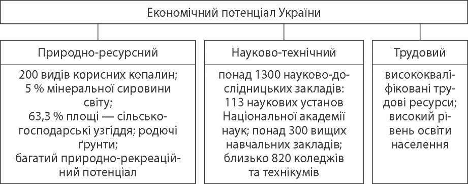 Як і інші країни — республіки колишнього СРСР, до такої ролі Україна не була достатньою мірою підготовлена. Старі виробничі, економічні, полі- тичні зв'язки з регіонами колишнього СРСР помітно скоротилися або ж були цілком зруйновані. У цій ситуації економіка України, яка була на стадії фор- мування, виявилася «сама по собі» у світовому господарстві, з якісно новими умовами функціонування, зв'язками, інфраструктурою. Світове господарство — сукупність національних господарств усіх країн світу і зв'язки між ними.  Перед нашою державою постало складне завдання: з одного боку, орі- єнтуватися на власний потенціал у формуванні нової економіки, а з іншо- го — визначити свою роль у світовому господарстві, налагодити нову систему економічних зв'язків. Україна увійшла в ряд міждержавних економічних об'єднань, стала чле- ном, у тому числі асоційованим, різних міжнародних структур, наприклад СНД (Співдружність Незалежних Держав). Визначені гарантії самостійності забезпечує Україні активна участь у про- грамі НАТО «Партнерство заради миру». Незалежна Україна проводить політику розширення партнерських відно- син з державами світу й особливо із сусідами першого і другого порядків: краї- нами Чорноморського басейну (Україна є членом цього об'єднання країн), країнами Дунайського басейну; країнами Вишеградського «чотирикутника» (Угорщина, Чехія, Словаччина, Польща). Економічна інтеграція — процес переплетення національних економік і проведення узгодженої міждержавної економічної політики. У цьому напрямку особливо важливим є підписання угоди про партнер- ство і співробітництво між Україною і країнами — членами Європейського Союзу. 9 листопада 1995 p. Україна стала членом Ради Європи. Україна першою з держав СНД зробила вирішальний крок у становленні договірно- правової основи співробітництва з ЄС. У 1992 p. було прийняте рішення про прийом України до найбільш важливих світових фінансово-кредитних організацій — Міжнародного валютного фонду і Міжнародного банку ре- конструкції та розвитку. Україна має реальні можливості для подальшого плідного розвитку зовнішніх економічних зв'язків. Так, за загальними запасами природних ресурсів і економічним потенціалом наша держава посідає восьме місце у світі. Україна входить у першу десятку країн світу з виробництва окремих 87