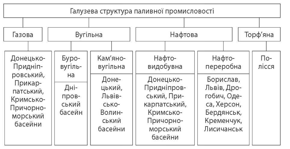 тя (майже 60 % видобутку нафти в Україні) — Бориславське (Львівська обл.), Долинське, Битківське (Івано-Франківська обл.). У Дніпровсько-Донецькій нафтогазоносній області також є великі родо- вища: нафтові — Леляківське (Чернігівська обл.), Глинсько-Розбишівське (Полтавська обл.), нафтогазові — Гнідинцівське (Чернігівська обл.), Кача- нівське (Сумська обл.), Яблунівське (Полтавська обл.). У Причорномор'ї поклади нафти виявлені на Керченському піоострові та в шельфовій зоні Чорного моря. Власної нафти в Україні недостатньо, тому значна її кількість завозиться з-за кордону. Газова промисловість. Великі родовища природного газу знаходяться в Дніпровсько-Донецькій нафтогазоносній області: Шебелинське, Західно- хрестищенське, Єфремівське (Харківська обл.). Близько 1/5 частини видобут- ку природного газу України зосереджено в Передкарпатті: Дашавське (Львів- ська обл.), Косівське, Надвірнянське (Івано-Франківська обл.) родовища. Значні родовища природного газу відкриті на півдні країни, насамперед у Криму. Основні родовища — Глібовське, Джанкойське. Зростає видобуток газу з дна Чорного моря. По території України пролягли численні газопроводи: Шебелинка—Хар- ків, Шебелинка—Полтава — Київ, Шебелинка—Дніпропетровськ—Кривий Ріг— Одеса—Кишинів, Шебелинка—Бєлгород—Москва, Дашава—Київ— Москва. Україна має великі перспективні нафтогазоносні площі. Природний газ — найефективніше паливо. Собівартість його видобутку значно нижча, ніж вугілля, а теплотворна здатність висока. Використання газу дуже перспек- тивне: в порівнянні з іншими енергетичними джерелами він майже не отруює навколишнє середовище. Газ використовують у виробництві як сировину для хімічної промисловості, а також для комунально-побутових потреб. Торф'яна промисловість розвивається на півночі України, у Поліссі (Чер- нігівська, Рівненська, Львівська, Житомирська, Волинська обл.). Торф як паливо має другорядне значення. Використовують його як місцеве паливо в сільській місцевості, на скляних, порцеляно-фаянсових, харчових підпри- ємствах. Для поліпшення транспортування з нього виготовляють торфобри- кети (Чернігівська, Житомирська, Львівська обл.). Структура видобутку палива в Україні Електроенергетика Електроенергетика — базова галузь промисловості, яка виробляє, пере- дає і трансформує електроенергію. 67