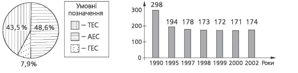 Електроенергетика — основа розвитку економіки. Розвиток електроенер- гетики, будівництво потужних електростанцій сприяють створенню нових промислових вузлів. Окремі галузі промисловості тяжіють до джерел дешевої електроенергії (електрометалургія), інші здатні обмежуватися транспортом електроенергії. Електроенергію в Україні виробляють теплові, гідравлічні, гідроакумулюючі й атомні станції. Найбільшу частку електроенергії (48,6 %) виробляють теплові елек- тростанції, що працюють на вугіллі, газі й мазуті. Найпотужніші з них розташовані в Донбасі (Старобешівська, Курахівська, Криворізька-2), у Харківській (Зміївська), Київській (Трипільська) і Вінницькій (Лади- женська) областях. Більшість ТЕС поряд з електроенергією виробляють і тепло для опалення міст. З роботою ТЕС пов'язане значне забруднення навколишнього середовища. Друге місце за обсягом виробництва електроенергії належить атомній енергетиці. Атомні електростанції будують у районах із дефіцитом паливних ресурсів. На території України працюють Запорізька, Півден- ноукраїнська, Рівненська, Хмельницька АЕС. Вони виробляють 43,5 % електроенергії країни. В Україні на Дніпрі та Дністрі побудовані великі гідроелектростанції. Найбільші з них: Дніпрогес, Дніпродзержинська, Дніпропетровська, Ка- нівська, Каховська, Київська, Кременчуцька. На гідроенергетику припадає лише 7,9 % загального виробництва електроенергії. ГЕС в Україні побудовані на рівнинних річках, тому перед їхніми гребля- ми створили штучні водоймища, що затопили сільськогосподарські угіддя, населені пункти. Вода водоймищ застоюється, акумулює різні шкідливі речовини. Греблі стають перешкодою розвитку рибного господарства, зава- жаючи міграції по річках промислових риб. У той же час вода з водоймищ використовується для зрошення посушливих земель Півдня України і сте- пового Криму. Електроенергія, вироблена електростанціями, передається до споживачів за допомогою ліній електропередач (ЛЕП). Україна має можливості використання сонячної, вітрової і геотермаль- ної енергії. У Криму побудована одна з перших геліоелектричних станцій (біля с. Мисове), уведені до дії вітроелектричні станції (АР Крим, Доне- цька обл.). Виробництво електроенергії в Україні Електроенергія, млрд кВт - год 68