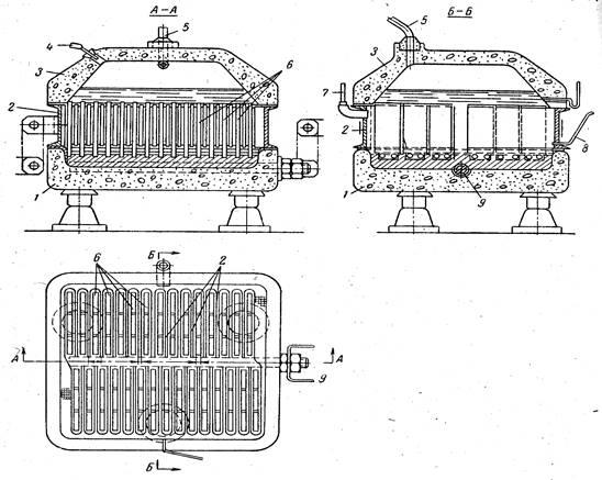 Примером ванны с осажденной диафрагмой может служить ванна Хукера типа S, рис. 2. Эта ванна состоит из трех основных частей — бетонного днища, стального катода и бетонной крышки. Днище имеет форму прямоугольного корыта, в котором залиты свинцом нижние концы графитовых анодов и медный стержень, служащий для подвода тока. Аноды представляют собой графитовые пластины. Катод — стальная рама, внутри которой смонтирован ряд плоских карманов из стальной сетки. Расположение карманов и их ширина таковы, что установке катода на днище ванны карманы помещаются точно между анодами.