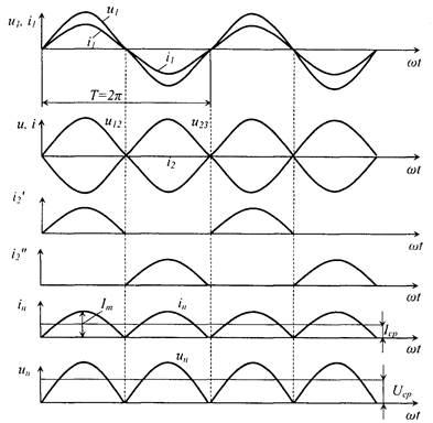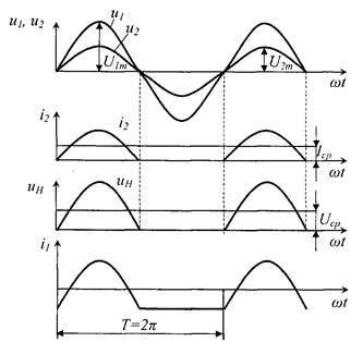 Временные диаграммы токов и напряжений для двухполупериодной выпрямительной мостовой схемы: