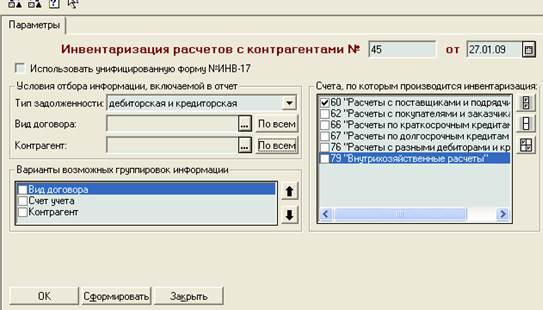 Рис.2 Форма для ввода параметров отчета «Инвентаризация расчетов с контрагентами»