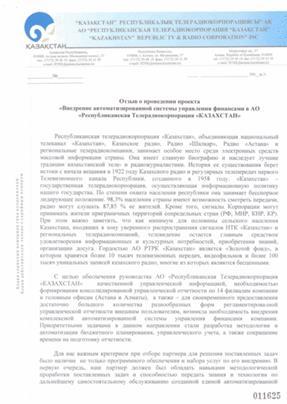 Отзыв о проведении проекта «Внедрение автоматизированной системы управления финансами в АО «Республиканская Телерадиокорпорация «КАЗАХСТАН»