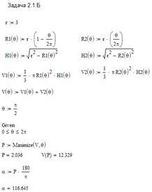 ) вирізають сектор з кутом , потім з іншого роблять цебро у виді конуса і з вирізаного сектора теж (тобто 2-а цебра). Необхідно розрахувати величину кута , тобто як необхідно розкроїти заготівлю, щоб обсяг 2-х цебер був максимальним.