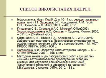 1. Інформатика: Навч. Посіб. Для 10-11 кл. середн. Загально освітн. шкіл/ І.Т. Зарецька, Б.Г. Колодязний, А.М. Гурій, О.Ю. Соколов. – Х.: Факт, 2001. – 496 с.: іл.