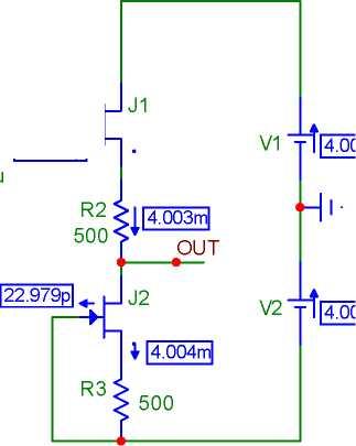 Ця схема має ще одну перевагу- малий вихідний опір при збереженні приблизної стабільності струму стоку Цбе/Язм. Однак існує проблема непередбачуваної (а тому ненульової) напруги зміщення від входу до виходу Цзв. Для даної ення входу непередбачуваного ( а тому ненульового і приблизної стабільності струму стоку зками по постійому струмусхеми вихідна напруга визначається сумою напруги сток-витікта емітер-база.