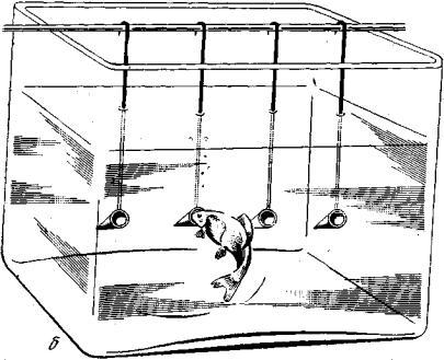 Рис. 3. а) аппарат Иеркса для изучения оптического различения у мелких животных; б) экспериментальное приспособление для изучения цветоразличения у рыб; прикорм находится только в кормушке определенного цвета (опыты Фишеля).