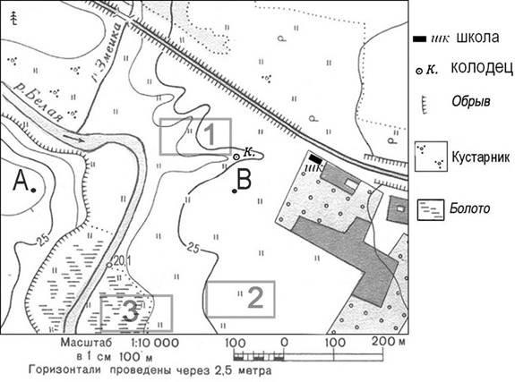Участники школьной футбольной секции выбирают место для нового футбольного поля. Оцените, какой из участков, обозначенных на карте цифрами 1, 2 и 3, наиболее подходит для футбольного поля. Для обоснования своего ответа приведите два довода. Ответ запишите на отдельном листе или бланке, указав сначала номер задания.