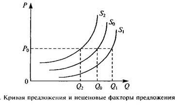Кривая предложения строится исходя из предположения, что все факторы, кроме рыночной цены, остаются неизменными. Кроме цены на объем предложения влияют многие другие факторы. Они получили название неценовых. Под воздействием изменения какого-то из них величины предложения меняются при каждой цене. В этом случае говорят, что происходит изменение предложения. Это проявляется в смешении кривой предложения вправо или влево.