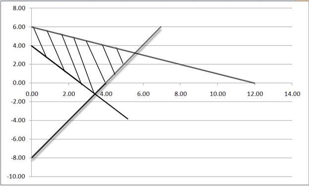 Это типичная двумерная задача линейного программирования. Целевая функция, которая должна быть максимизирована, является линейной функцией своих переменных. Ограничения на эти переменные тоже линейны (1).