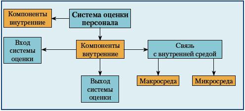Система оценки персонала объединяет две группы компонентов, обусловленных внутренней структурой (совокупностью взаимосвязанных элементов, созданных или привлеченных самой системой и обеспечивающих достижение ее целей) и внешним окружением (совокупностью элементов, посредством которых схема взаимодействует с внешней средой). К первой группе можно отнести фактически привлеченных субъектов и объектов оценки, набор эталонных и фактических показателей, критерии оценки, выбранные методы и средства и т. п.