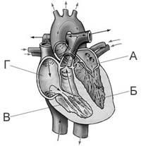 На рисунке изображена схема строения сердца человека. Какой буквой на ней обозначено правое предсердие?