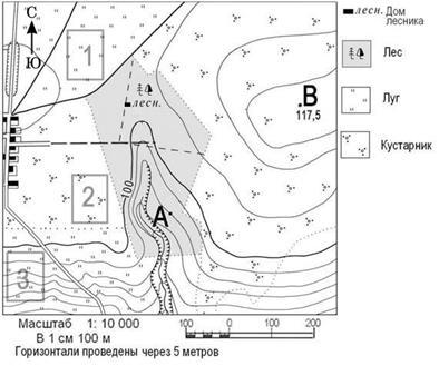 Участники школьной футбольной секции выбирают место для обустройства нового футбольного поля. Оцените, какой из участков, обозначенных на карте цифрами 1, 2 и 3, наиболее подходит для этого. Для обоснования своего ответа приведите два довода.