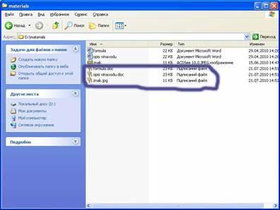 Наприклад, на диску d:\ в нас є папка d:\materials\, що містить файли матеріалів заявки: formula.doc, opis vinaxodu.doc (матеріали щодо заявки на винахід) та znak.jpg (зображення знаку для товарів і послуг).