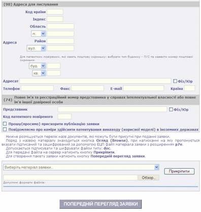 Попередній перегляд заявки – це режим остаточного перегляду заявку перед її реєстрацією. Перехід до попереднього перегляду заявки можливий, якщо електронний бланк заяви заповнено без помилок і немає помилок у прикріплених матеріалах заявки. Для переходу до попереднього перегляду необхідно натиснути кнопку “Попередній перегляд заявки”, що знаходиться під формою прикріплення матеріалів заявки.
