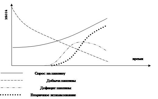 Платина - металл будущего. Но уже сегодня её применение не ограничивается ювелирными украшениями, и она завоевывает все новые и новые отрасли промышленности. Спрос на платину повышается. Увеличение спроса провоцирует увеличение предложения. Металлургические предприятия разрабатывают все больше и больше месторождений. Количество платины в земной коре уменьшается. В районах разработки разрушаются природные экосистемы. Если уровни добычи платины будут идти в том же темпе, то платины может не хватить, в частности для автомобилей на водородном топливе. Поэтому важна утилизация катализаторов. Это поможет избежать платинового "голода" в промышленности. Но сейчас, во время мирового экономического кризиса, цены на платину снизились, вследствие малой покупательской активности на рынке автомобилей. В России стандарты Евро-4 и Евро-5 еще не обязательны. И российские производители автомобилей не используют платиновые катализаторы [13].