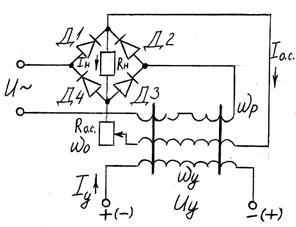 При рассмотрении процессов, проходящих в идеальном магнитном усилителе, отмечалось. Что ток управления можно представить как сумму постоянной и переменной составляющих, причём переменная составляющая изменяется с частотой, вдвое превышающей частоту питания. Если постоянная составляющая обусловлена управляющим сигналом Iy