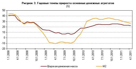 В соответствии с прогнозом социально-экономического развития Российской Федерации ожидается, что в 2011 году экономический рост будет обеспечиваться за счет как внешних факторов, связанных с благоприятной конъюнктурой мировых рынков сырья и капитала, так и внутренних, включая рост внутреннего спроса и постепенное восстановление кредитования банками реального сектора российской экономики. Тем не менее, в соответствии с прогнозными оценками в 2011‑2013 годах не ожидается существенного увеличения темпов экономического роста по сравнению с 2010 годом. При снижающейся инфляции это обусловит замедление роста транзакционной составляющей спроса на деньги. В то же время стабильный курс рубля будет способствовать росту спроса на национальную валюту как средство сбережения. В зависимости от вариантов прогноза прирост денежного агрегата М2 в 2011 году может составить 11‑23%, в 2012 году – 14‑20% и в 2013 году – 13‑17%.